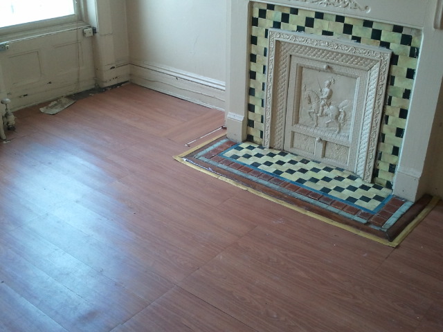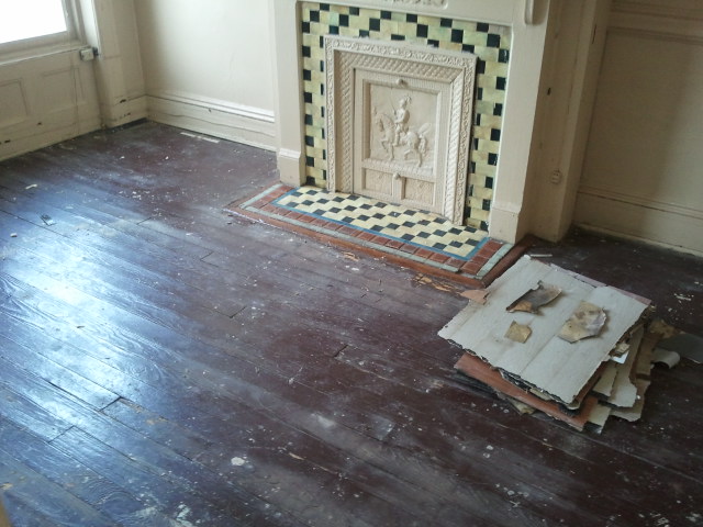 There is still a huge amount of work ahead to get these floors in any kind of decent shape. We are hoping to save most of it, although the front room (the foreground in the picture above) has some serious damage – which was not helped at all by the tile glue. I was bummed that I didn’t find oak flooring with intricate inlay patterns. But I am ecstatic that at least it’s no longer covered in Dinosaur-by-product.