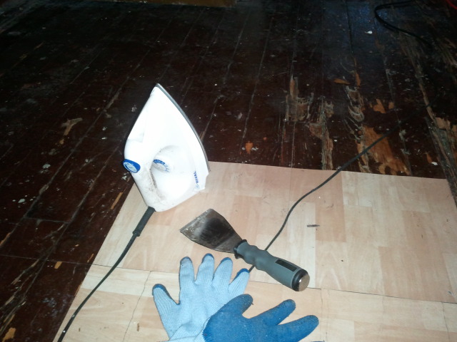 Of course, the top floor of the house was covered in vinyl flooring. In some cases, many layers of vinyl flooring, like a sandwich of ugliness. I spent two days pulling it up with my trusty Rival iron, a scrape-y tool and the most amazing pair of work gloves I have ever owned. In this case, good gloves were key, since this crap is sticky beyond belief.