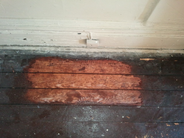 Some portions of the floor are quite damaged. We did a test sand and fake finish (with beeswax oil) and it looks like this: