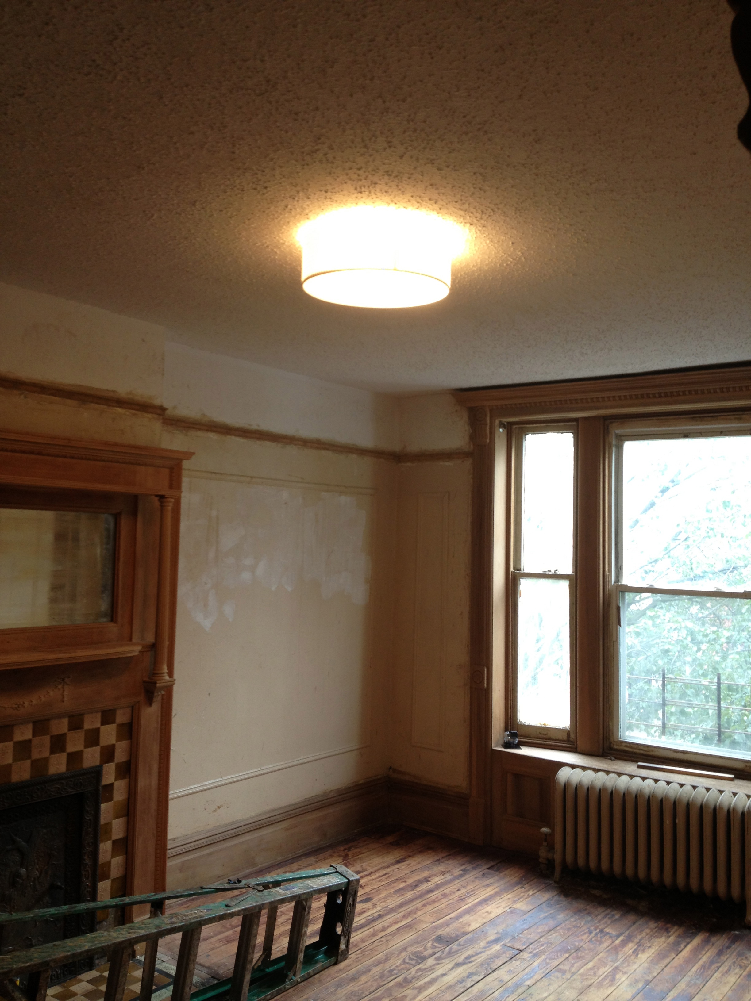 With the ceiling gone, we had a good look at the space above – more like a crawl space than an attic, it’s called a cock loft (and yes, because I’m totally immature I can’t say it without giggling). It’s kinda interesting to see the structure from above: the sky lights, some strange built-in alcoves. The filth up there is indescribable, the dirt is nearly impossible to wash off the skin. I suppose that’s what 120 years of dust, coal, cigarette smoke, and old fart residue looks like. Absolutely gross.