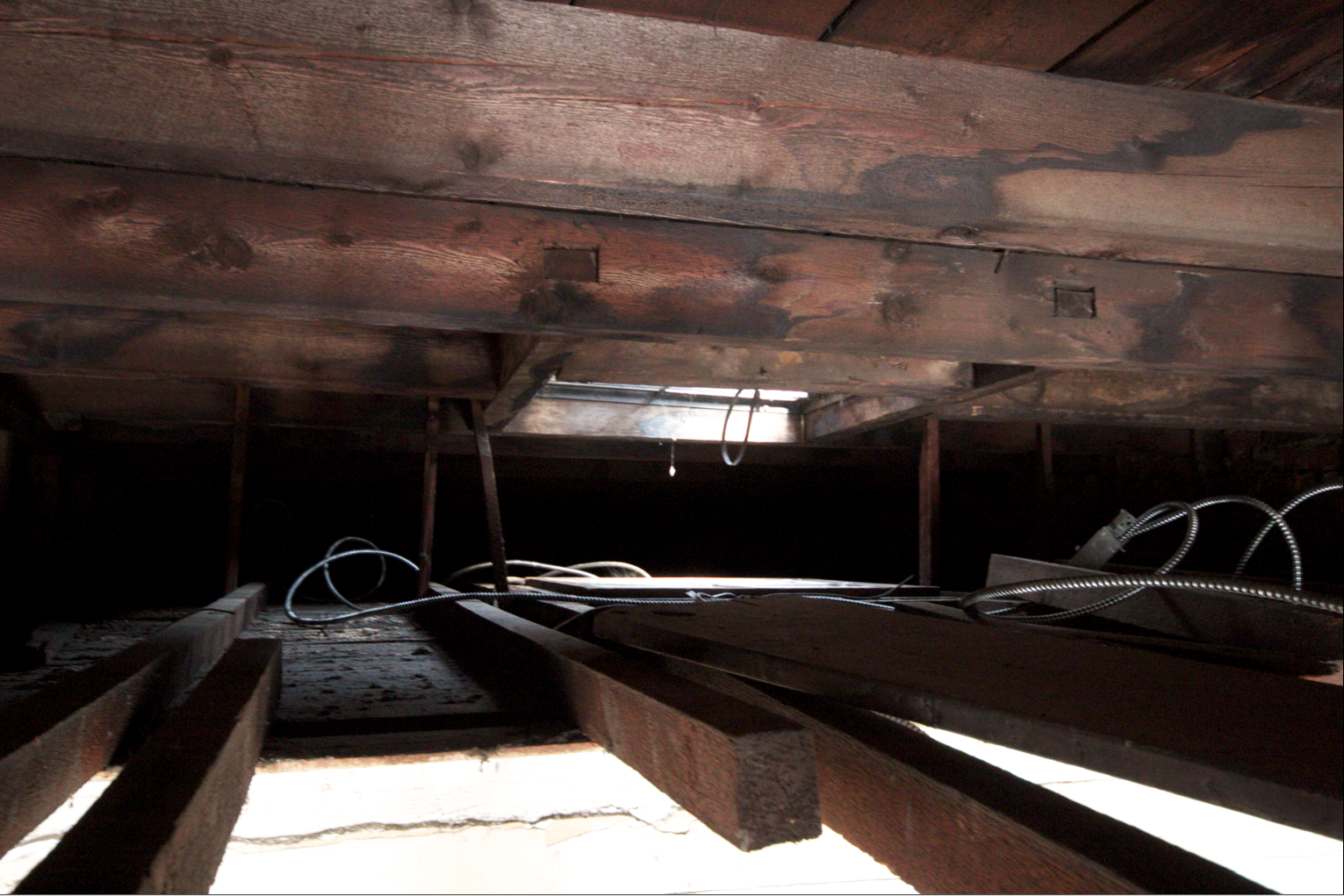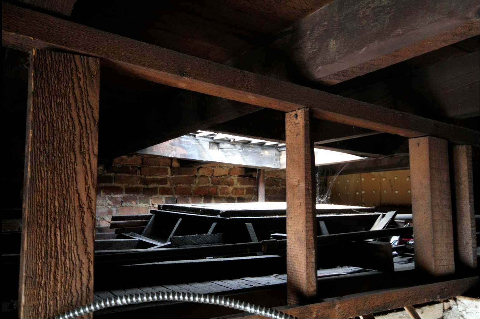 With the ceiling gone, we had a good look at the space above – more like a crawl space than an attic, it’s called a cock loft (and yes, because I’m totally immature I can’t say it without giggling). It’s kinda interesting to see the structure from above: the sky lights, some strange built-in alcoves. The filth up there is indescribable, the dirt is nearly impossible to wash off the skin. I suppose that’s what 120 years of dust, coal, cigarette smoke, and old fart residue looks like. Absolutely gross.