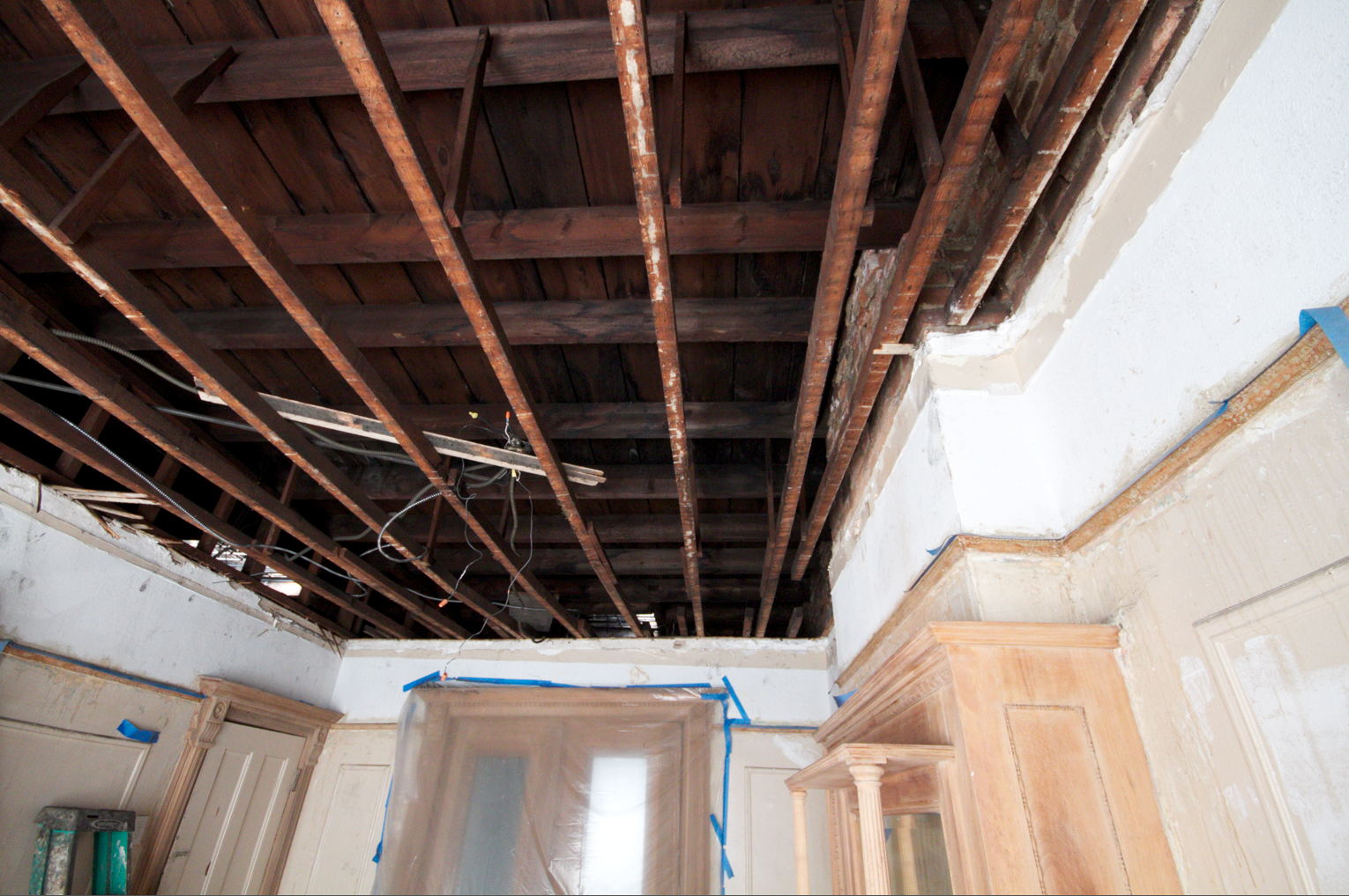 Dry wall pulled down, you can see the old ceiling through the 2x4s