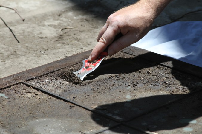 Gross, right? The first we* attacked it with our trusty PeelAway 6. It worked OK, but since we were working outside we decided to give harsher chemicals a try (Zip Strip). It worked OK, too – but not that much better. Because the third time is the charm, we tried a heat gun. Our previous concerns of scorching woodwork didn’t apply here, so we went to town: