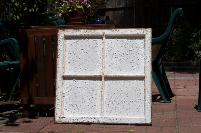 It’s on the window of the bathroom air shaft. We’re working on peeling back the years of paint to let in some light in. I almost feel bad for making Charlie go away.
