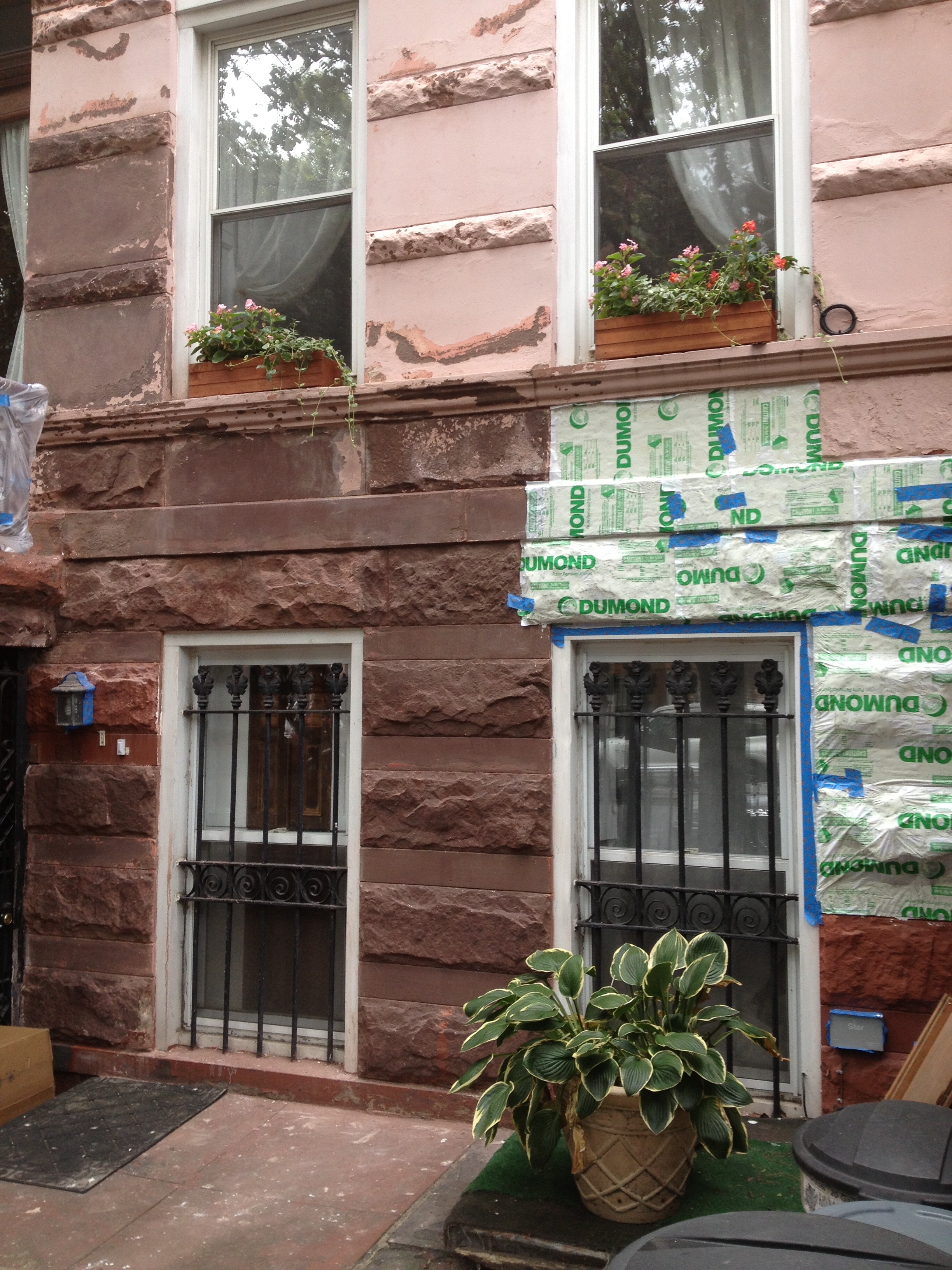Progress is slow but steady, with a good portion of the paint on the garden level gone. For most part, it’s a pretty straight forward process: apply the goop, cover with paper, wait, scrape, wash. Repeat if necessary. But since this is a learn-by-doing type of project, I found out that removing paint from where the stone has been patched is  nearly impossible. It takes a combination of Peel Away 1 and Peel Away 7, and still the results are ‘meh’ at best. You can see splotches of stubborn pink on the far right of the wall on the top of the stoop, and also under one of the parlor windows. It simply does not want to go away. I’ve experimented with dwell times and it seems that a minimum of 24 hours is necessary. In some cases, 48 is actually better. Rain doesn’t seem to be a problem, so long as the area is covered with the paper stuff.  Just to be safe, I tape up the edges with painter’s tape.